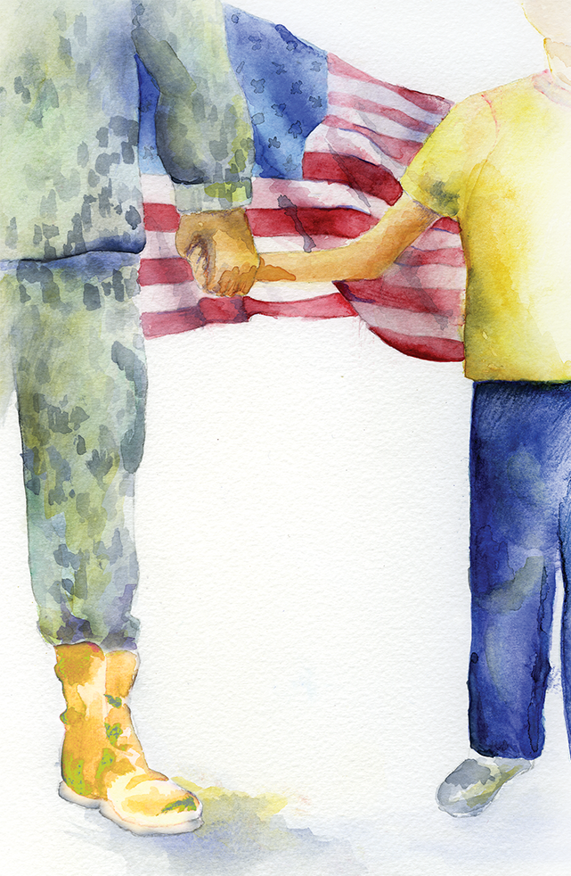 Part of a watercolor series created for the Military Child Education Coalition’s annual conference, the first illustration focuses on the bond between a service member and child. Soft washes, loose edges, and translucent color convey connection, resilience, and the quiet strength of military families.