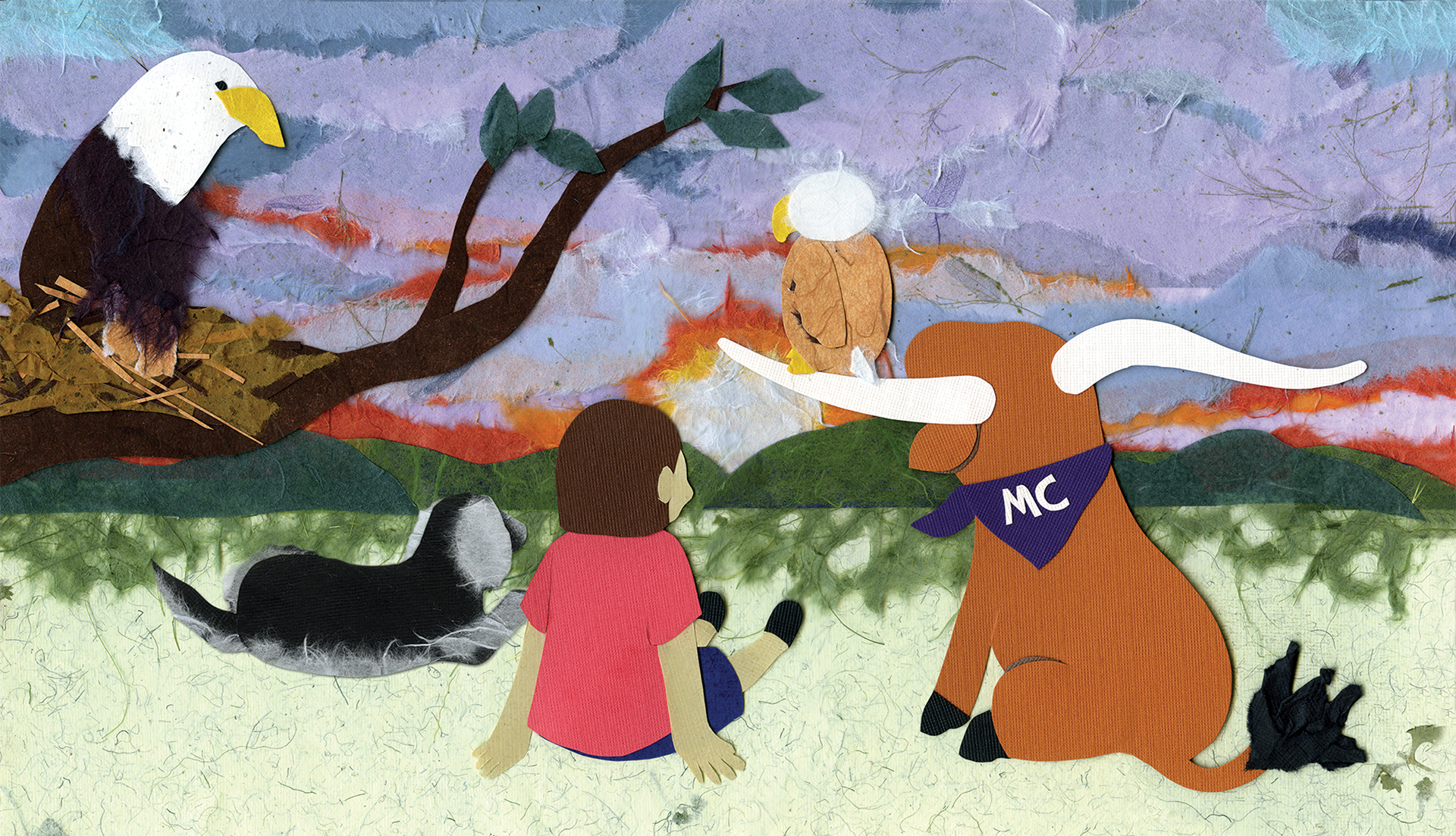 The second piece is a full spread from MC & Me, a children’s book published by the Military Child Education Coalition, where textured paper layers were used to build an expressive landscape and capture a moment of friendship between a child and MC the Longhorn. Together, these pieces showcase how traditional, handcrafted media can bring narrative depth and emotional resonance to educational and children’s content.