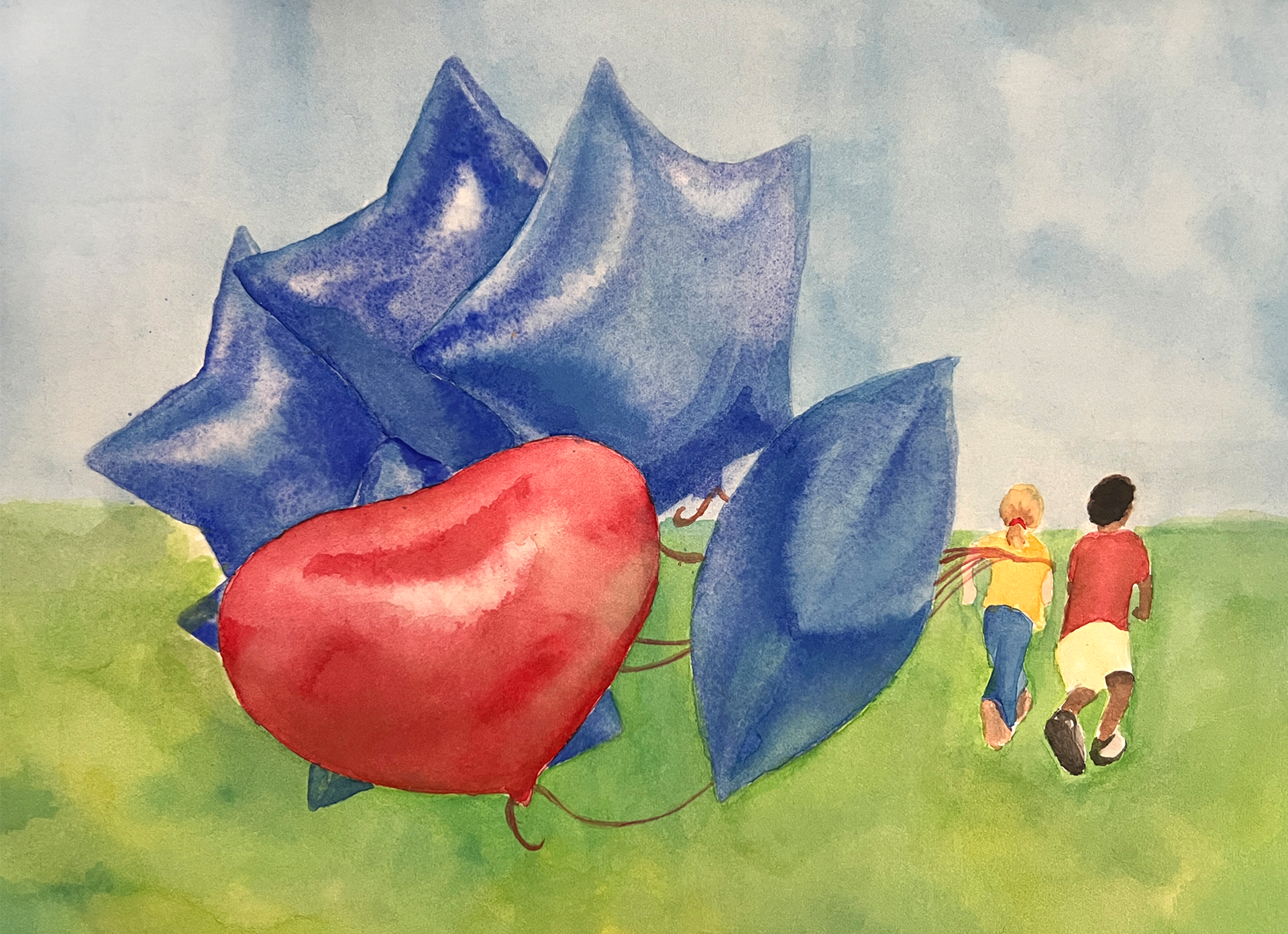 Created for a school convocation theme, this watercolor captures two children running forward as a cluster of balloons trail behind them. The loose washes and bright palette evoke momentum, optimism, and the buoyant energy of a new school year.