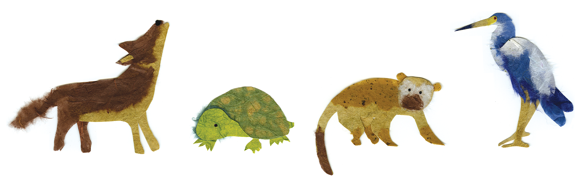 These paper collages reflect my tactile approach to storytelling through layered texture, color, and cut/torn-paper detail. The first set of animal illustrations was created for an MCEC Tell Me A Story “Fortune Teller” activity, using hand-torn papers to give each character warmth and personality.