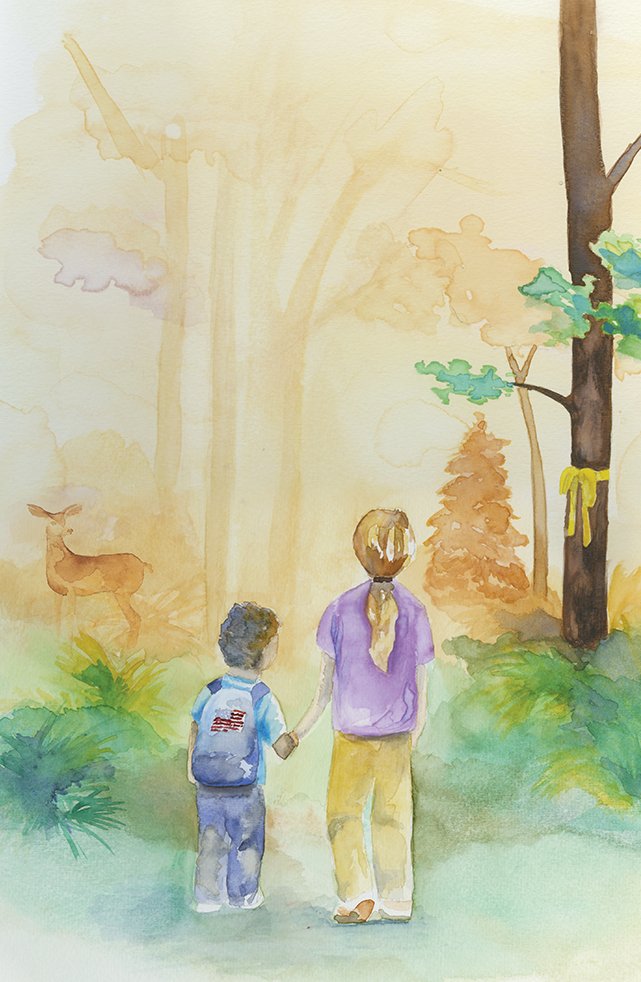The second centered on the theme of Trailblazers depicts two children walking together into uncharted territory. The warm horizon and layered washes evoke exploration, guidance, and the courage children show as they navigate new paths side by side.