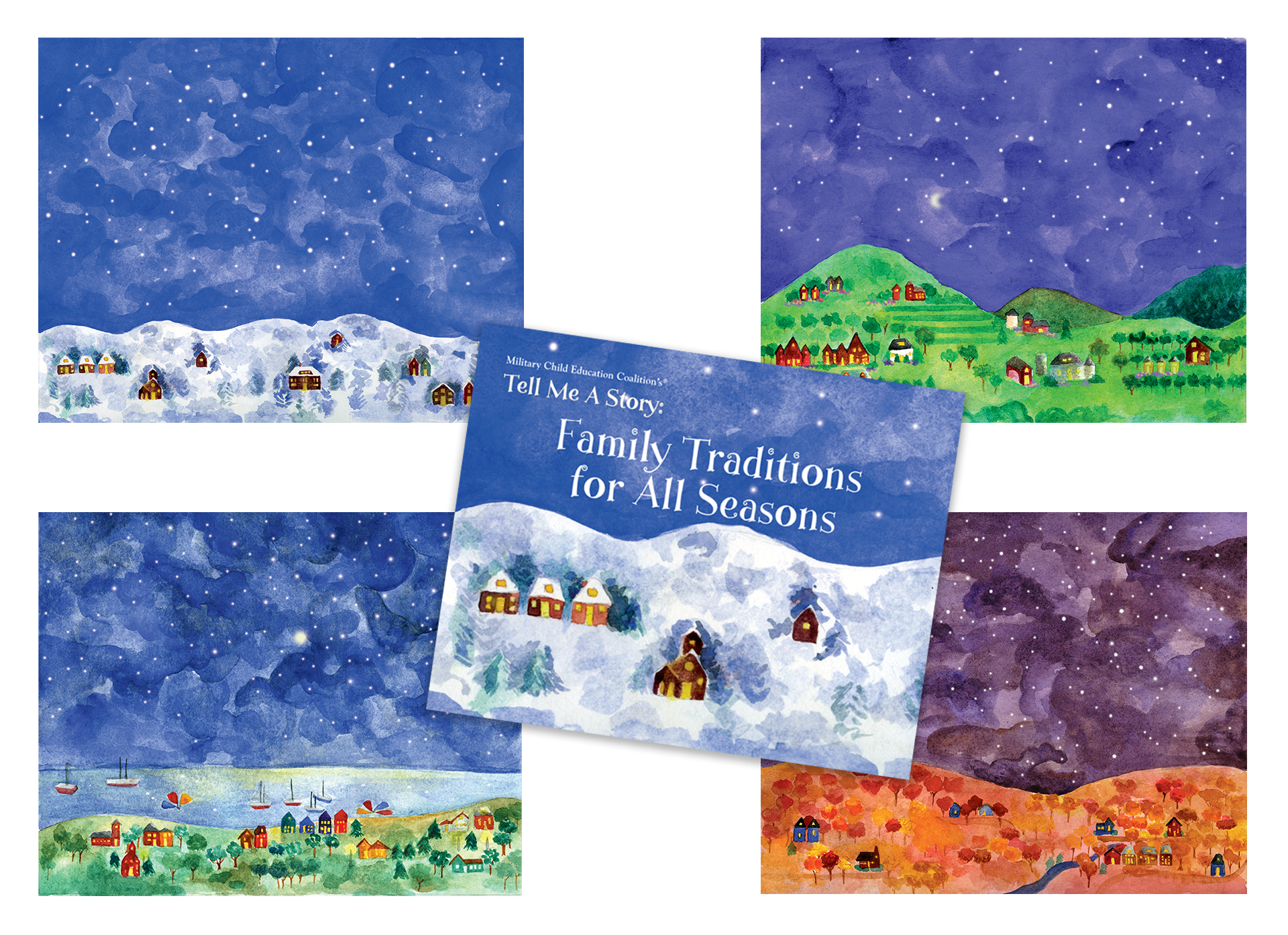 Created for MCEC’s Tell Me A Story initiative, this series of seasonal landscape watercolors forms the visual foundation of the Family Traditions for All Seasons workbook. Each scene — winter, spring, summer, and fall — was painted to evoke the rhythms of family life throughout the year, pairing soft washes and luminous night skies with small, warmly lit homes scattered across textured hills. The illustrations provide a gentle, inviting backdrop for families as they reflect on their traditions together.